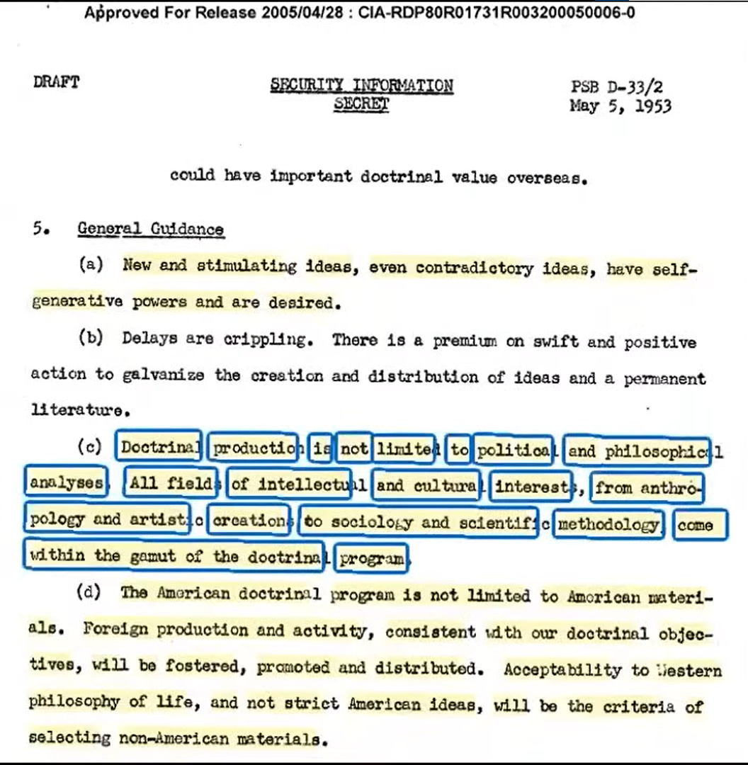 Ένα υπόμνημα της PSB από το 1953. Ένα από τα πράγματα που ισχυρίζονται [τα υπομνήματα του Psychological Strategy Board] είναι ότι «Η παραγωγή δογμάτων δεν περιορίζεται σε πολιτικές και φιλοσοφικές αναλύσεις. Όλοι οι τομείς διανοητικών και πολιτιστικών ενδιαφερόντων, από την ανθρωπολογία και την καλλιτεχνική δημιουργία μέχρι την κοινωνιολογία και την επιστημονική μεθοδολογία, εμπίπτουν στο εύρος του προγράμματος του πολέμου των δογμάτων/διδασκαλιών [doctrinal program]». [Doctrinal Warfare]. Και πάλι, αυτό που επιδιώκουν είναι η πλήρης κυριαρχία.