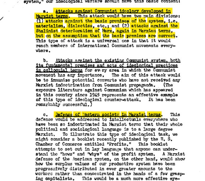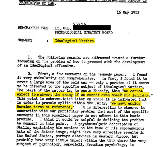 Στο υπόμνημα του Συμβουλίου Ψυχολογικής Στρατηγικής (Psychological Strategy Board, PSB) του 1952 τονιζόταν σχετικά με τον «Ιδεολογικό Πόλεμο» ότι «δε μπορούμε να αναμένουμε να υπονομεύσουμε τον εχθρό εάν δε μπορούμε καν να μιλήσουμε τη γλώσσα του. […] Πρέπει να χρησιμοποιήσουμε μαρξική ορολογία αναφοράς». Το εξηγούν λεπτομερέστερα: Χρειάζονται «επιθέσεις κατά της κομμουνιστικής ιδεολογίας ανεπτυγμένες με μαρξιστική ορολογία».